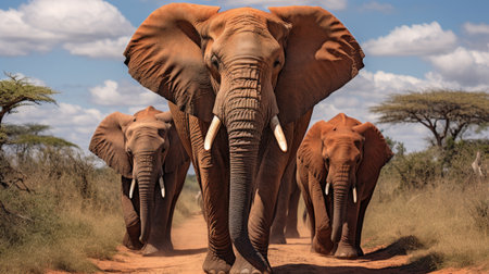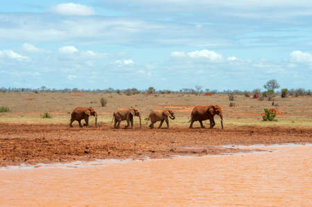 Travelling Kenya, safari tours bunch of red elephants in the savanna Safari tour in Africa, Tanzania national park