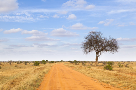 Red ground road and bush with savanna landscape in Africa. Tsavo West, Kenya.