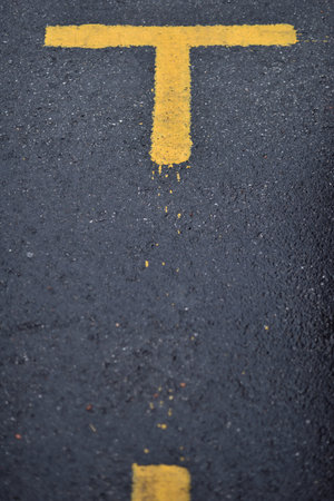 A yellow traffic sign lines marked on the asphalt road with a group of splashed yellow paints in between.