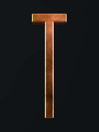 3d render of golden metal dirty rust scratch alphabet letter symbol - T. Alphabet character on the dark background
