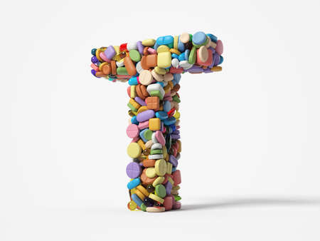 different pills stack in shape of letter T. suitable for medicine, healthcare and science themes. 3D illustration, isolated on white background