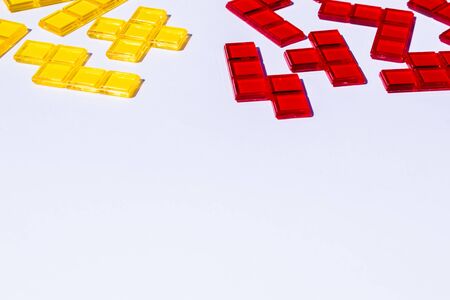Colorful groups of square blocks on white background, high contrast, red and yellow transparent tiles matched by color, copy space, plenty of text room