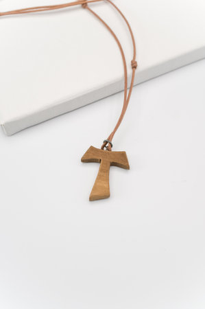 isolated hand carved solid wood greek letter tau pendant with space for text