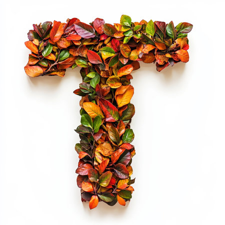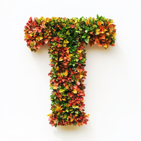Alphabet letter T made of fall leaves, flowers. berries. Vibrant autumn colours. White clean background. Generative AI.