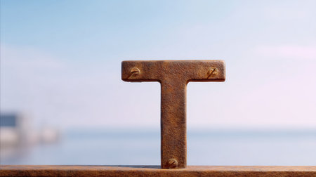 A closeup of rustic iron letter t, oxidized with weathered texture, set against serene background of water and sky, evoking sense of calm and nostalgia