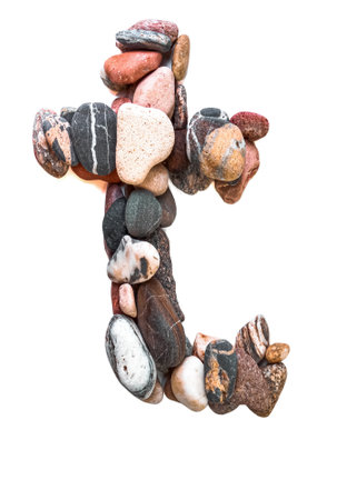 A letter of smooth stones on a white isolated background. Of the river stones lined with a letter, detailing, close-up. selective focus.