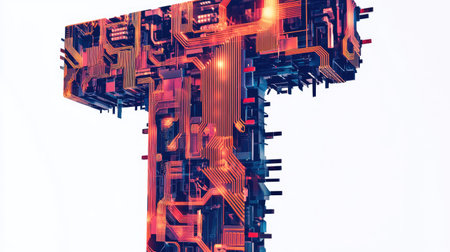 A large, bold letter T filled with intricate circuits and digital patterns, representing technology and innovation, set against a clean white background.