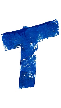 T character typography in blue brush on white