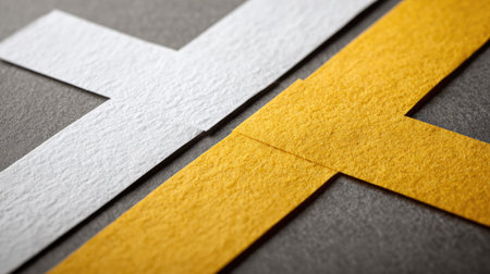 Close-up of white and yellow paper strips intersecting on a gray surface, showcasing a unique blend of colors and textures, perfect for artistic and design projects.