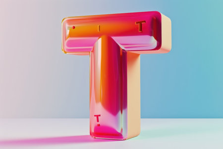 A colorful T made of glass. The T is in a very bright color and is very shiny