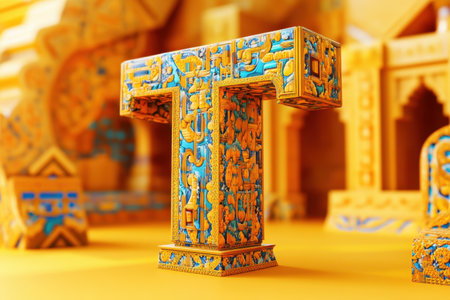 The letter T is made of gold and has a lot of intricate designs