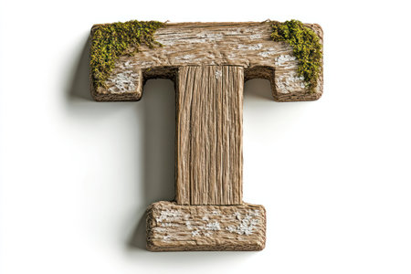 Bold rustic wooden capital letter T, aged oak wood, moss growing in crevices, white background.