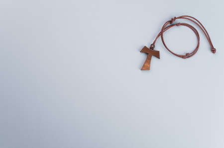 A closeup of a wooden tau cross necklace isolated on a gray background
