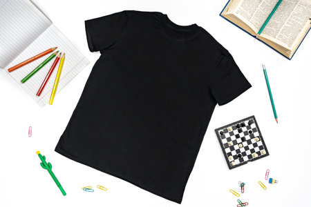 A mock-up of an empty black T-shirt with accessories on the table. lifestyle concept.