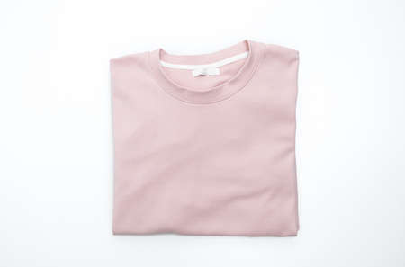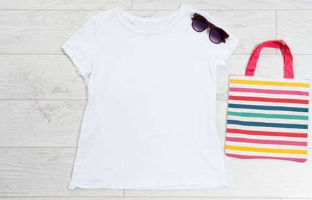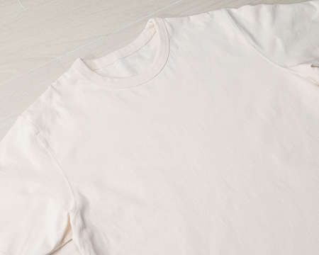 T-shirt top view, t shirt mock up, empty tshirt. Summer concept casual clothes background copy space. Blank shirt on wooden background