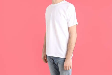 Man in blank white t-shirt on pink background