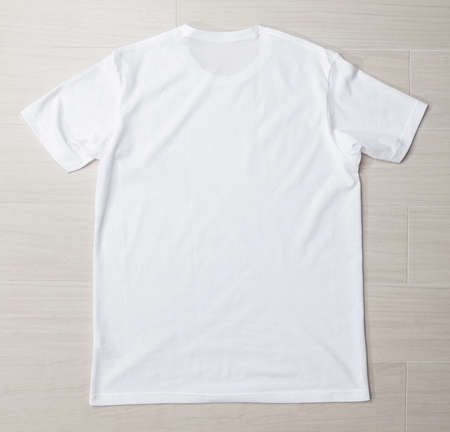 Blank white T-shirt mockup template on the floor.