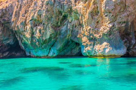 Rocky coast of the island of Sardinia in the Mediterranean Sea in sunlight in spring