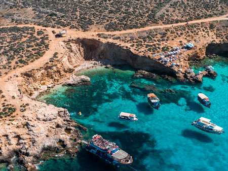 Aerial view of Blue Lagoon waters and coves on Comino Island, Malta