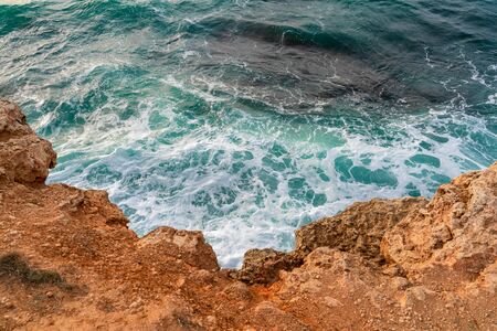 View from the high stone shore of the sea foaming waves and fantastic rocky coast