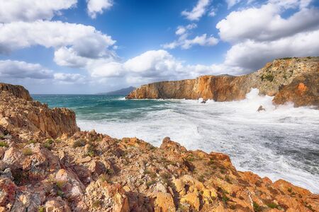 Fantastic view of cliffs in valley Cala Domestica and storm on the sea. Location: Buggerru, South Sardinia, Italy Europe