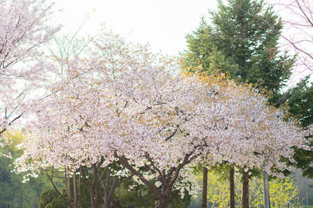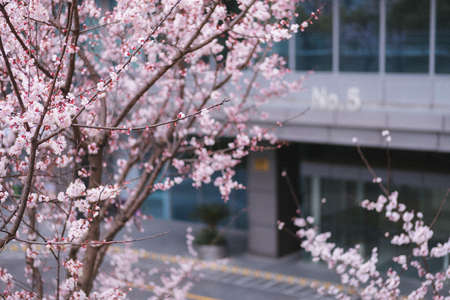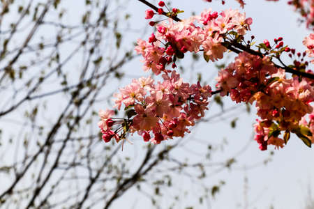 Pink cherry blossom blooms beautifully on a tree branch. The combination with the deep red color is very pretty. Beautiful and fragrant. A small type of flower that makes many people want to see it.