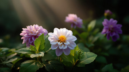 This image showcases delicate flowers illuminated by soft sunlight, creating a serene garden scene filled with vibrant colors and tranquil beauty. Perfect for nature lovers.