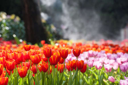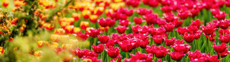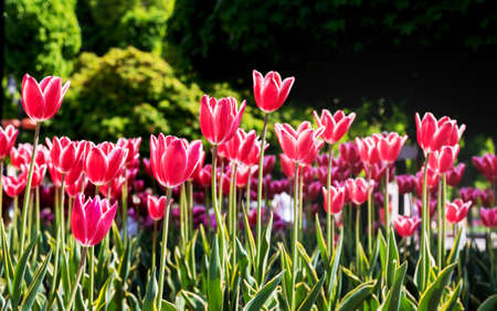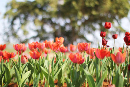 Colorful tulip flowers blooming in the garden. Spring landscape.