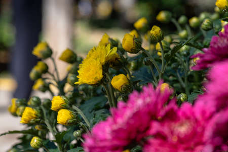 Colorful yellow and pink flowers bloom beautifully, showing nature's artistry during springtime.