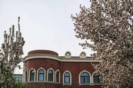 Blooming magnolia tree against the background of an old house, Vinnytsya, Ukraine