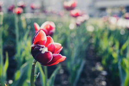 red opened tulip in the daytime in the park. bright sunny day, greening in the city