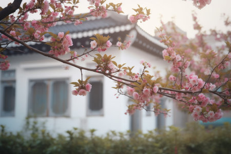 Pink cherry blossoms on a branch against dark background in classical Chinese garden