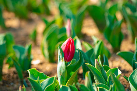 Red tulip growth among yellow tulip background (Concept for differentiate from other, leader or unique)