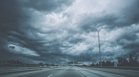 A striking image of an empty highway under a dramatic stormy sky, filled with dark clouds. The scene captures a sense of isolation and the beauty of nature's power.
