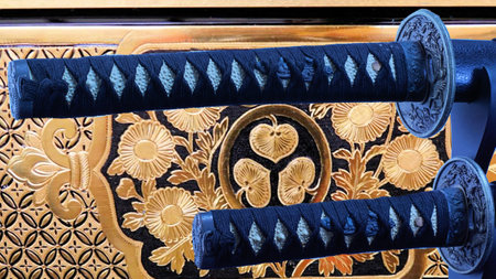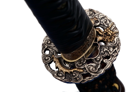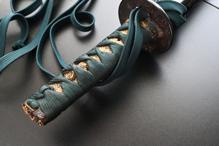 Close-up of a samurai sword on a black background. Selective focus