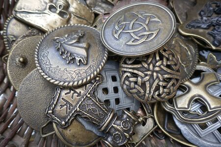 Brass and bronze brooches, viking brooches of brass and bronze. Many different old brooches on a medieval market in Schleswig-Holstein, Germany, Europe