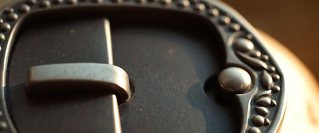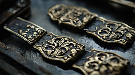 Explore a captivating image of ornate vintage decorative metal buckles featuring intricate floral patterns, beautifully showcased against a leather backdrop.