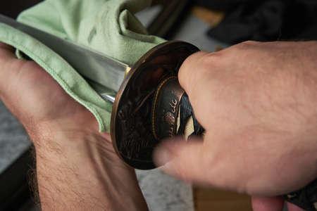 Man cleans blade of traditional Japanese katana sword