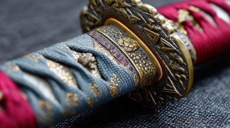 A close-up of a traditional sword's ornate handle, featuring rich red and blue fabric, gold accents, and detailed engravings that showcase exceptional craftsmanship and cultural artistry