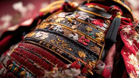 This image captures the exquisite craftsmanship of traditional Japanese armor, showcasing vibrant colors and intricate ornamentation that reflects cultural heritage.