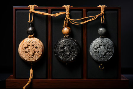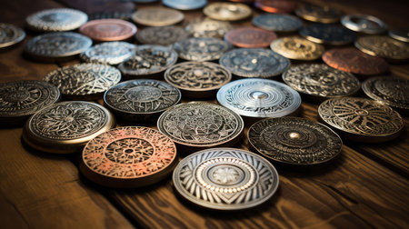 Close-up view of beautifully engraved medallions displaying detailed cultural symbols, showcasing craftsmanship. The background appears solid, enhancing the medallions' shine and beauty.
