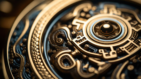 A close up of a gold watch with intricate designs, AI