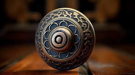 A close up of a decorative door knob on top of wood, AI