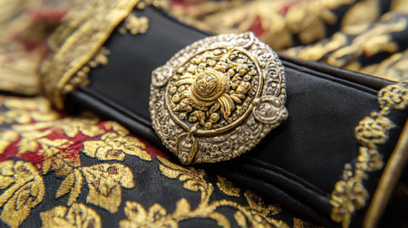 A close-up view of a beautifully crafted metallic ornament on a rich textile, highlighting intricate design and traditional artistry in textile craftsmanship and cultural heritage.