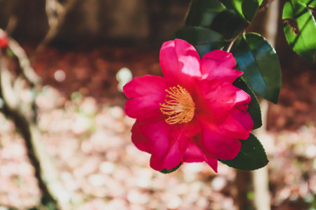 Vibrant pink Japanese camellia flower blossoms with lush green leaves in natural setting