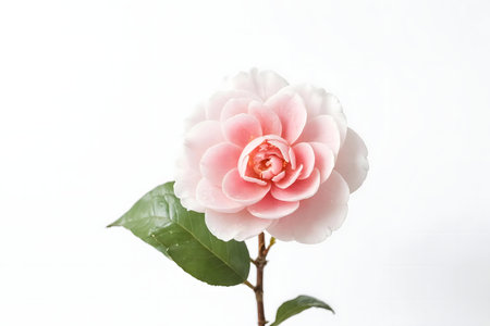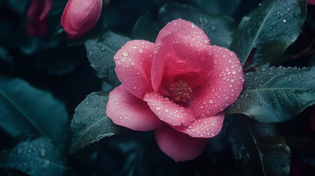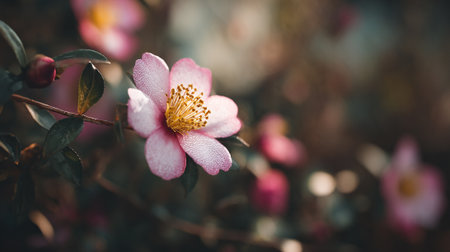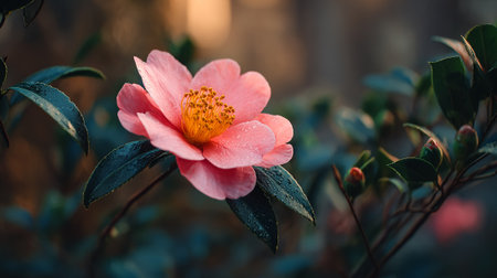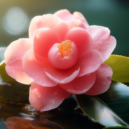 Elegant Pink Camellia Flower With Dew Drops in Natural Light