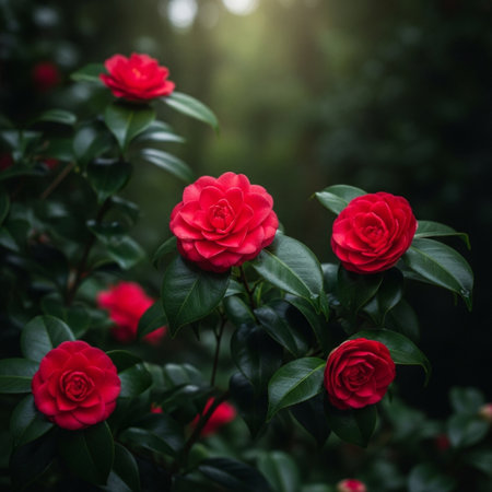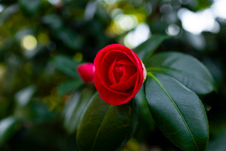 Vibrant red camellia blossom among lush green leaves in soft focus