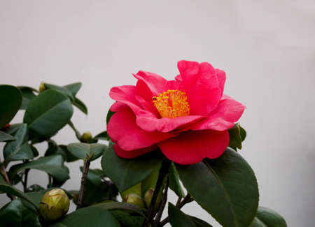 Beautiful Camellia flower in bloom, with green leaves and buds.