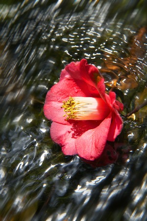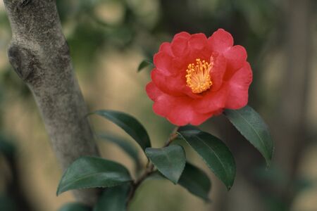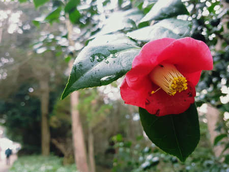 Camellia japonica red flower. Sakurajima, a volcanic island in Kyushu's Kagoshima Prefecture.
