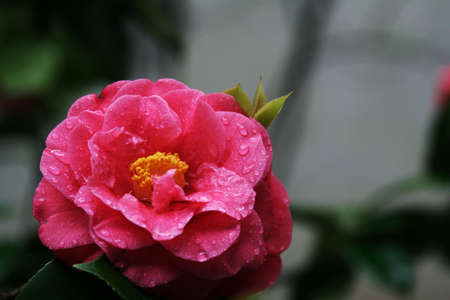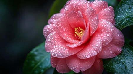 Camellia pink flower with water drops on the petals, yellow stamens and green foliage. Camellia japonica flowering plant. Japanese camellia ornamental shrub in the garden.